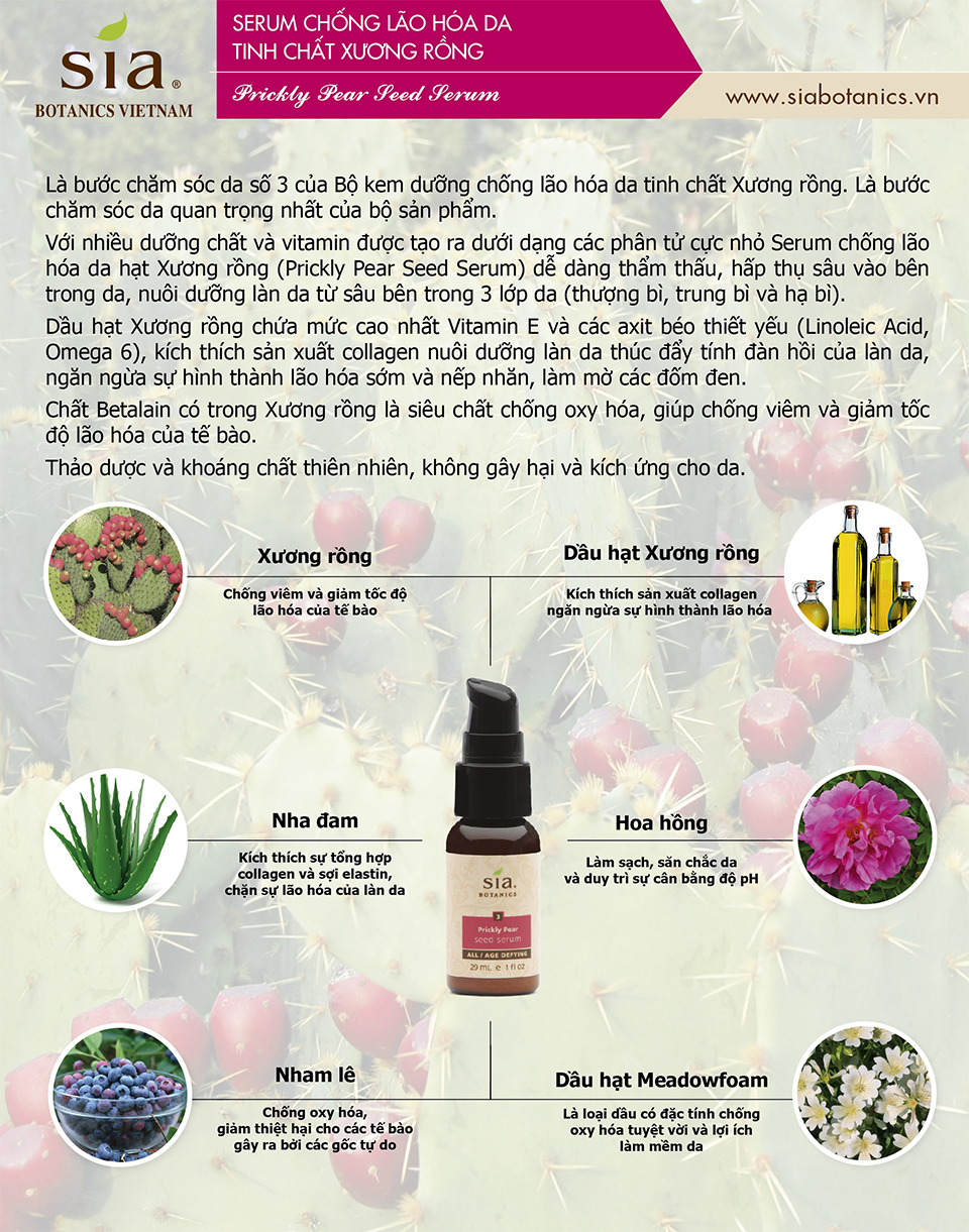 Nước ép và dầu hạt xương rồng sẽ cung cấp siêu chất chống oxy hóa và chất chống viêm Betalains đối với các tế bào da. Retinol, Alpha Lipoic Acid, Vitamin C Ester, Coenzyme Q10, vitamin A, B, C và E và nhiều chiết xuất trái cây tạo thành một siêu chất của các thành phần sinh học tích cực cải thiện bề mặt và kết cấu da